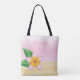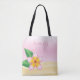 This tote bag features Destei's illustration of a pink and orange colour frangipani plumeria flower with green leaves. The background colour is pink with sand texture on the bottom. There is also a personalizable text area for a name.