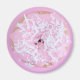 A pink frosted cake doughnut, sprinkled with coconut shavings, set on a pink magnet