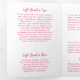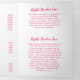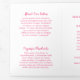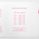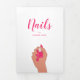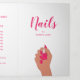 Modern nail salon trifold brochure featuring a simple design with an illustration of a hand with fuschia pink nails holding a bottle of nail polish along with "Nails" by your name in script on the cover page. The back panel has your hours of operation and contact information. The inner fold panel has two headers and text boxes. The inside has multiple templates for information about your business on the outer panels and a price list in the middle panel. All text is hot pink over a white background.