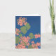 A notecard with a screenprinted design of salmon pink geraniums on a deep blue background. Left blank inside for your own message.