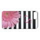 Pretty black and white striped iPhone 7/8 case, with graphics of a big pink Gerber daisy peeking over the left bottom, of the case. Personalize the pink one letter monogram to suit your needs.