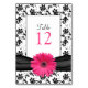 Use the personalize option to change the table number on these pink gerbera daisy black floral damask and ribbon wedding or other special occasion table cards. Please NOTE: You MUST change the table number on each card and add one of each number to your cart. If you want to do more extensive changes including changing the font, font colour, or font size, use the customize option.