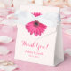 Hot pink gerbera daisy (gerber daisy) and subtle white lace personalized wedding thank you favour box. You can personalize the bride and groom's name and the wedding date. A pretty pink gerbera daisy floral flower design. Perfect as a wedding favour box for a spring or summer wedding.