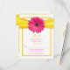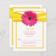 The text and background colour on this pink gerbera daisy and yellow ribbon response or rsvp card is fully customizable. To change the text, use the personalize option. For more extensive text changes, such as changes to the font, font colour, font size, text layout or background colour, use the customize option. The colours on this card are yellow, pink, and white. This card is currently setup to print on the linen paper type, but would look nice on any of the other paper types. NOTE: We don't suggest using the basic paper for response cards, as the basic paper is semi-glossy on the front making your RSVP cards hard to write on. To change the paper type, click on the invitation options tab. This card would also work well as a direction, reception, or accommodation card. All you need to do is change the text.