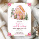 This elegant and festive birthday party invitation features a watercolor gingerbread house and beautiful pink poinsettia flowers. The text combines handwritten script and sans serif fonts for a stylish and modern look. The snowman, decorated pine trees and holiday wreath add a festive touch. This is perfect for Christmas birthday parties.