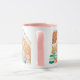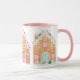 This cute gingerbread house coffee mug is all decked out for Christmas with a gumdrop roof and white frosting and candy details! There are three gingerbread houses around the mug. Colours include pink, aqua, brown and white.