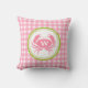 A pillow featuring a pink gingham design on front and back. Pink crab on front. Personalize with your initial.