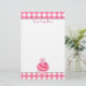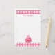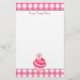 Stationery featuring a pink gingham border across top and bottom.  Personalize with your name at top.  Illustration of a raspberry cupcake at bottom.  Personalize the letter on the cupcake topper with your initial.