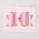 A postcard with a glitzy shiny bow with gold outline and a faceted pink gemstone in the centre. Feminine luxury glam.