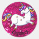 A cute rainbow unicorn sticker featuring a tubby little unicorn with rainbow mane and tale, leaping in the air over a bed of pink glitter. She has golden hooves, a rainbow horn, and golden stars on her body. The name can be easily customized underneath. Great for kids' unicorn parties!