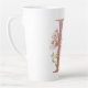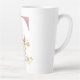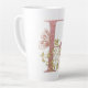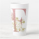 Pretty latte mug features pink glitter initial / letter F with gold leaves and swirls and coppery butterfly overlay