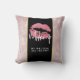 Pillow with your business info. Designed with a background composed with a modern trendy rose gold tropical leaves pattern. Layered over top is a black frame with a gold gradient border, inside are pink glittery lips.