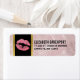 Address labels with a background composed with a modern trendy rose gold tropical leaves pattern. Layered over top is a black frame with a gold gradient border, inside are pink glittery lips.