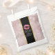Favour bag with a background composed with a modern trendy rose gold tropical leaves pattern. Layered over top is a black frame with a gold gradient border, inside are pink glittery lips.