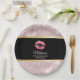 Paper plates with a background composed with a modern trendy rose gold tropical leaves pattern. Layered over top is a black frame with a gold gradient border, inside are pink glittery lips.
