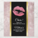 Bachelorette party (or other event) bottle labels with a background composed with a modern trendy rose gold tropical leaves pattern. Layered over top is a black frame with a gold gradient border, inside are pink glittery lips.
