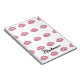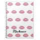This cute custom notebook features a glamourous and girly kiss mark theme. Pink glitter style lips are tiled across the front over a white background. A sample name is printed near the bottom which you can personalize to include your own custom name or text.