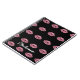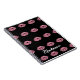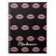 This cute custom notebook features a glamourous and girly kiss mark theme over a black background. Pink glitter style lips are tiled across the front over a white background. A sample name is printed near the bottom which you can personalize to include your own custom name or text.