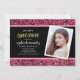 Pink Glitter Photo Quinceañera Invitation features the words "Quinceañera" in a fun sans serif font in faux gold foil with a pink faux glitter top and bottom and a black centre background. Invitation has a pink, black and faux gold foil stripes pattern back side.