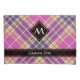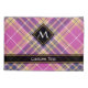 Pink, golden yellow and blue tartan design. Seamless pattern. Custom text and monogram.