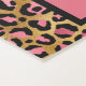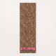 Modern yoga mat features a black, gold and pink leopard print. At the bottom is a template for you to put your name, that has a pink background with a black edge.