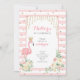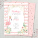 Trendy watercolor flamingo invitation featuring pink and white stripes with gold dots and curtain. So cute!
