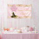 Pink and gold high heel shoe birthday party banner with pretty pink balloons, high heel shoes and pearls on a pink satin swirl background. This beautiful pink and gold birthday party banner is easily customized with the text of your choice. This is a printed design with no real satin, glitter, pearls, etc.