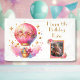 Pink and gold personalized birthday party banner with a pretty hot air balloon and basket full of gifts. Personalized with birthday girl's photo, name and age.