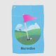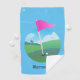 A simple illustration featuring a pink golf flag on a putting green. We've added a sky blue background to the design but feel free to change that. Add your name to the golf towel for personalization. Also makes a wonderful gift for a lady golfer.