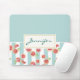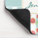 A personalized mouse pad with a repeating digital pattern of pink grapefruits created with watercolors, set on a pastel green and white striped pattern, positioned along the bottom of this item. The top 2/3s of the item has a pastel green background. A white nameplate with a gold coloured border holds your personalized name inside.