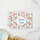 A thank you card with a repeating digital pattern of pink grapefruits created with watercolors, set on a pastel green and white striped pattern, A white circle with a gold coloured border in the centre with your personalized text.