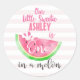 Cute pink watercolor one is a melon birthday favor sticker featuring a large watermelon slice and some decorative watercolor text on a white and pink striped background.