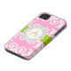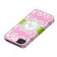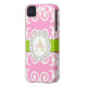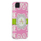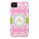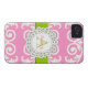 Girly Personalized Pink and Green Swirls Floral printed iPhone 4 Case. Make a fashion statement with this monogram initial and name printed on a circular floral design with a green line on a pink damask pattern this hard shell case.