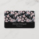 Business cards with an elegant pattern made with a watercolor illustration of pink flowers with blue-grey leaves and stems with a classy black background.