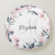 A round pillow with an elegant pattern made with a watercolor illustration of pink flowers with blue-grey leaves and stems. A white circle layered over top with your name and monogram initial inside.