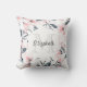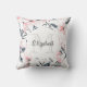 A pillow with an elegant pattern made with a watercolor illustration of pink flowers with blue-grey leaves and stems. A white circle layered over top with your name and monogram initial inside.