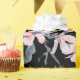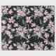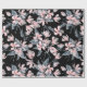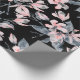 Wrapping paper with an elegant pattern made with a watercolor illustration of pink flowers with blue-grey leaves and stems. Classy black background.