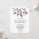 A wedding inivtation with a pretty watercolor illustration of pink flowers with grey leaves on a single stem. A modern elegant botanical design. White background.