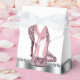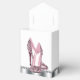 Beautiful black and pink glitter high heel shoe party favour boxes. These elegant pink glitter high heel shoe favour boxes can be customized with text and you can change the background colour and bow colour.