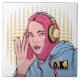 A pink hair don't care design. A woman or teenager with pink hair listen to music. She is waving. This is drawn in a comic book or pop art style.