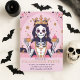 Throw a frightfully fabulous Halloween bash with this cute and glam pink Halloween party invitation! Featuring a sugar skull princess holding cupcakes, sparkly gold stars, and pastel pumpkins, this card is perfect for girls' Halloween parties, costume events, or spooky birthday celebrations. Personalize the event details easily online and impress your guests with this unique and enchanting Halloween invite.