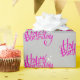 Pink happy birthday fun font with white stars on grey background.