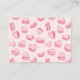 Whimsical Valentine theme baby shower book request card featuring illustration of pink heart-shaped macarons. The card asks guests to bring in a new or used children's book instead of a card.
