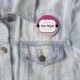 Perfect badge for your girls out on your hen night. The background of the badge is separated into two halves by a black band running horizontally across the centre. The top half is a plain dark pink while the bottom half is a pink glitter effect. Over the background is a white quatrefoil framed in black with templates to add your details in pink and black lettering.