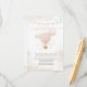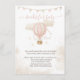 Cute baby shower invitation features pink hot air balloon with clouds.