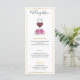 A 4" x 9" wedding menu featuring watercolor pink hydrangeas and a glass of red wine, elegantly framed in gold. The menu includes options for Hors D'oeuvres, Entrées, and Desserts, and the reverse side is customizable with the bride and groom’s names.