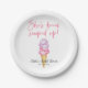 Whimsical ice cream theme bridal shower paper plate featuring watercolor illustration of pink and purple ice cream scoops on a waffle cone. The text says "she's been scooped up!" Perfect for a summer bridal shower or wedding shower.