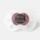 Chic baby's pacifier, with graphics of a black and salmon pink jaguar fur pattern, with a black disc, in the middle. Pink custom text, on the black disc reads, Wild Child, and can be personalized to read what you want. Great baby shower gift idea, matching products available.