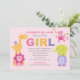 This colourful baby shower invitation features a playful stack of jungle animal friends — lion, giraffe, monkey, elephant, and hippo — surrounding bold "GIRL" text in bright rainbow colours. The fun safari theme is perfect for a baby girl celebration, with pink, orange, green, purple, and grey accents throughout. A coordinating pink polka dot backing completes the two-sided design. All wording is fully customizable for your event.