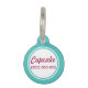 Cute pink cartoon cupcake character illustration with a happy face expression. The background colour is turquoise, but it can be changed to any other colour. On the other side there are personalizable text areas for the name of the pet and for a phone number.